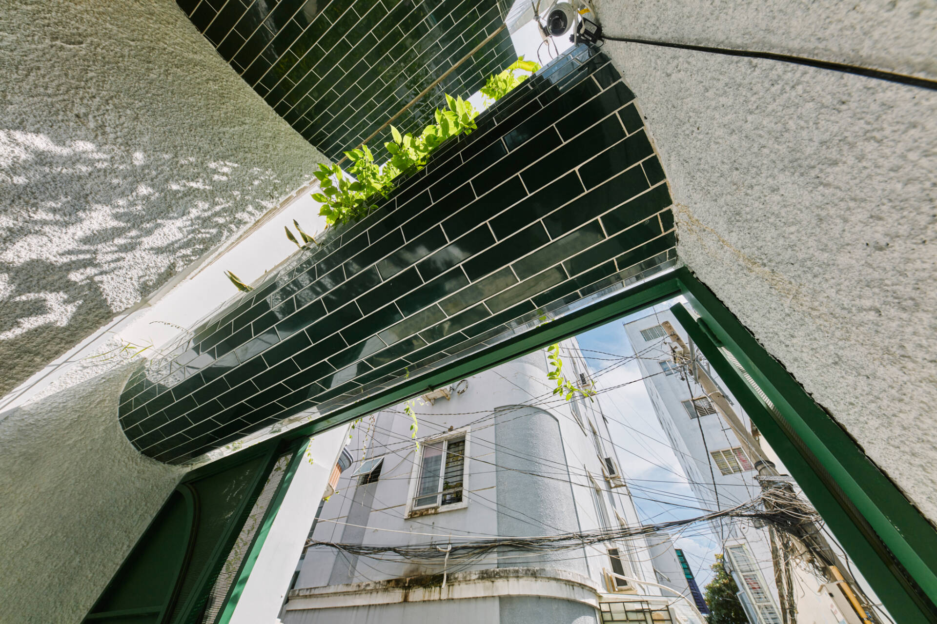 Không gian khá nhỏ và các công năng ở được sử dụng triệt để, nên gần như không có quá nhiều chỗ cho các mảng cây xanh được chen vào và làm dịu lại mật độ sử dụng dày đặc của cả căn nhà, cũng như của cả khu phố xung quanh. Nên chúng tôi tận dung tối đa các phần đầu cổng vào, ban công và một chút khe hở sau bếp để đây mảng cây xanh vào từ đó mở các góc nhìn từ các phòng ra một cách cẩn trọng để giữ được sự riêng tư cần thiết cho căn nhà.