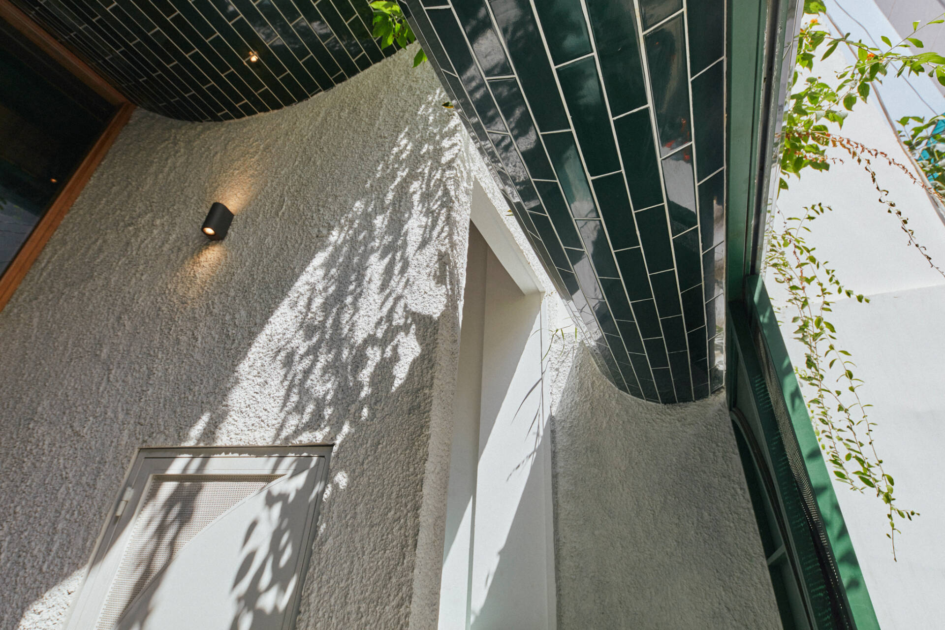 Chúng tôi bắt đầu nghiên cứu sắp xếp không gian bên trong căn nhà sao cho các chức năng ở và thuê bên trong được riêng tư so với bối cảnh đô thị dày đặc nhà cửa bên ngoài nhưng vẫn lấy được ánh sáng và sự thông thoáng từ bên ngoài. Mặt cắt cho thấy cấu trúc đặc biệt của mỗi tầng – một ban công giật cấp để lấy sáng từ trên cao xuống phòng và cùng lúc tránh bị những ô cửa sổ nhìn trực diện từ các ngôi nhà san sát xung quanh của con hẻm. Những phần giật cấp này đồng thới tạo nên những phần trần cong vươn lên, đẩy ánh sáng gián tiếp vào trong phòng và là điểm nhấn cho mỗi tầng. Chúng tôi quyết định chọn gạch thẻ xanh làm điểm nhấn cho phần trần này. Độ bóng bề mặt của gạch cũng là điểm tương phản cho chất liệu tường trắng xù xì và chất liệu bê tông thô của những mảng lam che nắng mặt tiền.