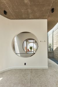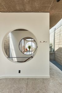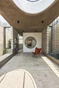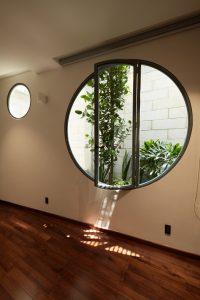 The master bedroom on the first floor features a wide wooden bed platform lit by the skylight, with glimpses of greenery from the en suite. Children’s rooms are framed by circular windows that open to small planters, inviting nature indoors.