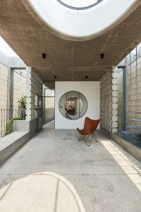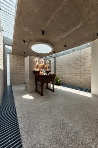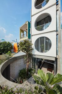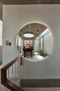 The top floor houses an open, greenery-filled worship space and a front terrace that doubles as a photography set for the owner’s fashion work. Perforated circular openings run throughout this level, creating spatial continuity while expressing the homeowner’s openness and playful character.