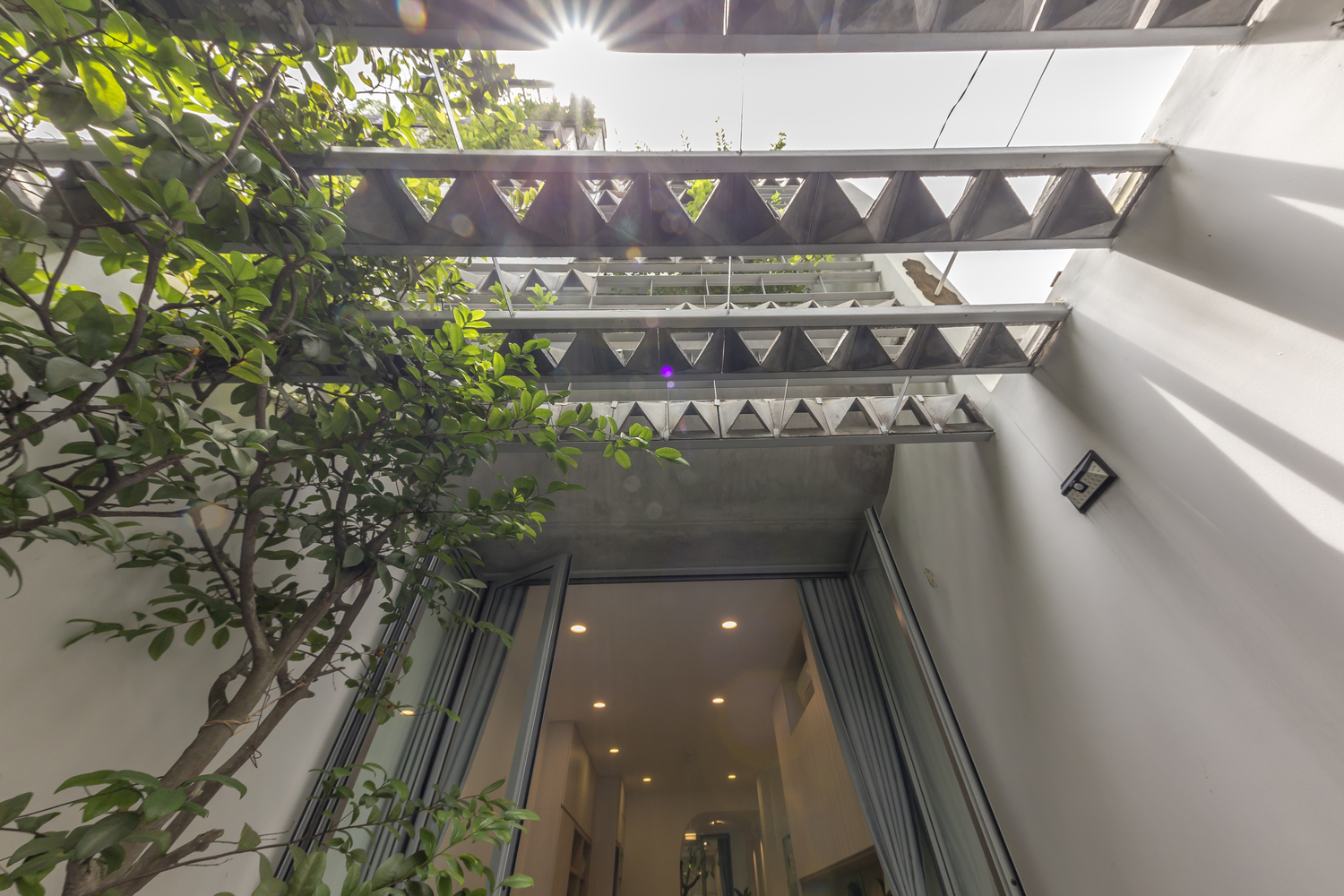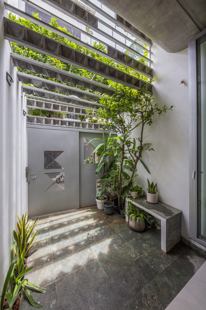 Hệ lam gió mặt tiền được thiết kế với những khe hở an ninh vừa đủ và điểm xuyết những viên gạch bông gió để che nắng và tạo điểm nhấn cho căn nhà. Đồng thời hệ lam cũng là dàn leo cho cây cối ở mặt tiền, để dần dần cây xanh sẽ phủ che mát công trình và tạo nên một tấm rèm xanh riêng tư cho không gian sống bên trong.