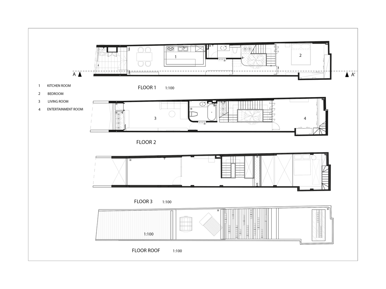 Cấu trúc khối công trình bo cong dần lên trên, để giảm đi dần diện tích ở các tầng trên vì chủ nhà không có quá nhiều nhu cầu ở tại các tầng trên. Từ đó việc mặt tiền bo cong dần lên mái cũng góp phần tăng diện tích lấy sáng đưa ánh sáng đi sâu vào công trình vốn dĩ hẹp và dài.